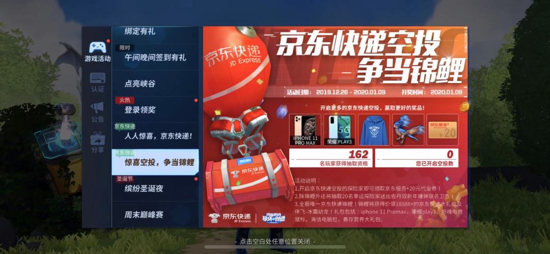 除此以外,“京东锤神空投战”也在今天正式打响:活动期间启明星之谷内将出现特殊的京东快递空投,打开京东快递空投即可参与锦鲤抽奖活动赢取奖励。开启京东快递空投数量越多,获奖概率越大!