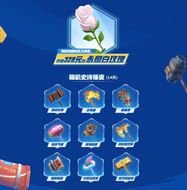 “京东快递锤神专享礼包”内含京东快递限定套装一套、京东快递【个人寄件业务】3元优惠券1张、随机获得一件神秘史诗级拆卸武器外观(14天),更有机会获得价值388元的永久史诗级拆卸武器外观——“永恒白玫瑰”!