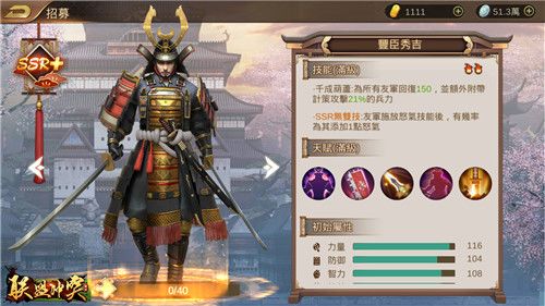 丰臣秀吉是继室町幕府之后,首次以天下人的称号统一日本的战国三杰之一。天下人指能统一天下的大名,丰臣秀吉本是下级步兵,后因侍奉织田信长而崛起。本能寺之变后,在织田氏诸家臣内部斗争中胜出,成为织田信长实质的接班人。在游戏中丰臣秀吉与织田信长都属于高力量属性的攻击型武将。