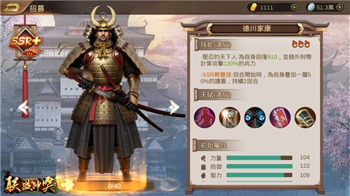 德川家康,江户幕府第一代征夷大将军。日本历史上杰出的政治家和军事家。经大坂夏、冬之阵灭丰臣氏,江户幕府统治体制从此坚如磐石。德川家康建立了德川幕府后,日本进入暂时的和平。与织田信长和丰臣秀吉不同,德川家康防御和统帅属性最高。
