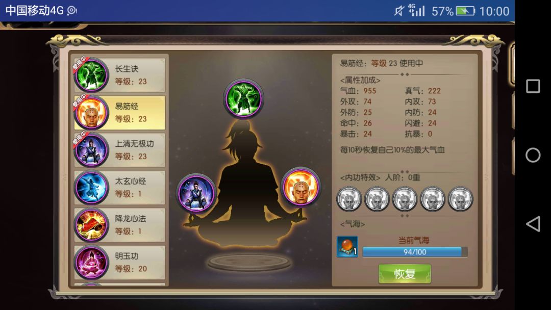 有第一个特效的长生诀加成2000血量,易筋经保证回血,上清无极功保证蓝量,通过保证是可以的,三星的话要注意自己的血量不要被压得过低。
