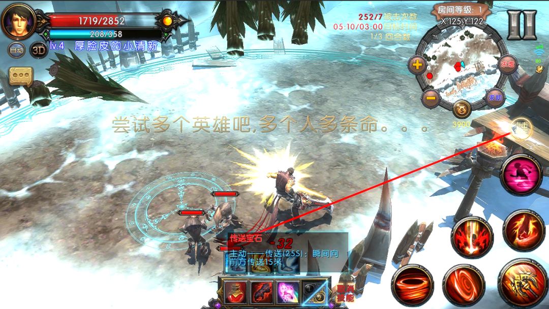 各种装备不同的属性,包括基本的加血,加攻,加防,加攻击速度,移动速度等,还包括传送,技能伤害反弹,吸血,范围内加属性等,变化组合多达上百种呢!以下是使用传送装备演示图: