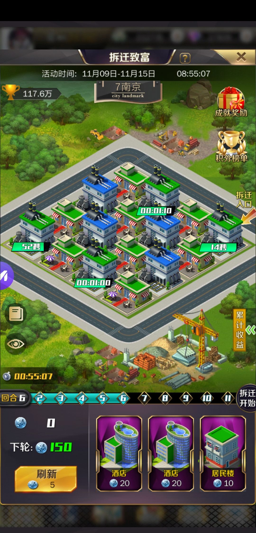 个人理解,居民楼从来不买,活动第四天工厂出了以后只买工厂和餐厅,餐厅够八个后只买工厂,一般结束后都会够两个五级工厂,如果差一个两个工厂能合俩五级卖其他建筑也要买,直接摆拆迁路口前两个,这个活动我玩了五次每次都是第一,这次差的最多,第四天时差了三萬出工厂后用我的方法两天就反超两萬五,这是最后一天第一也是稳的,