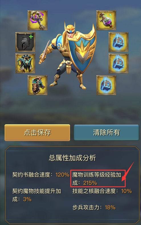 一套魔物养成专用金装下来,共可提高215%的魔物经验(小元注:橙装的话是281%,但出于性价比的考虑,相信很少领主会将魔物装备提升至橙装)。