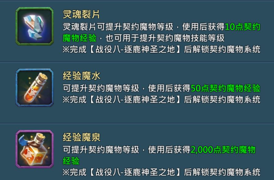 目前共有以下三种道具能够提升魔物经验: