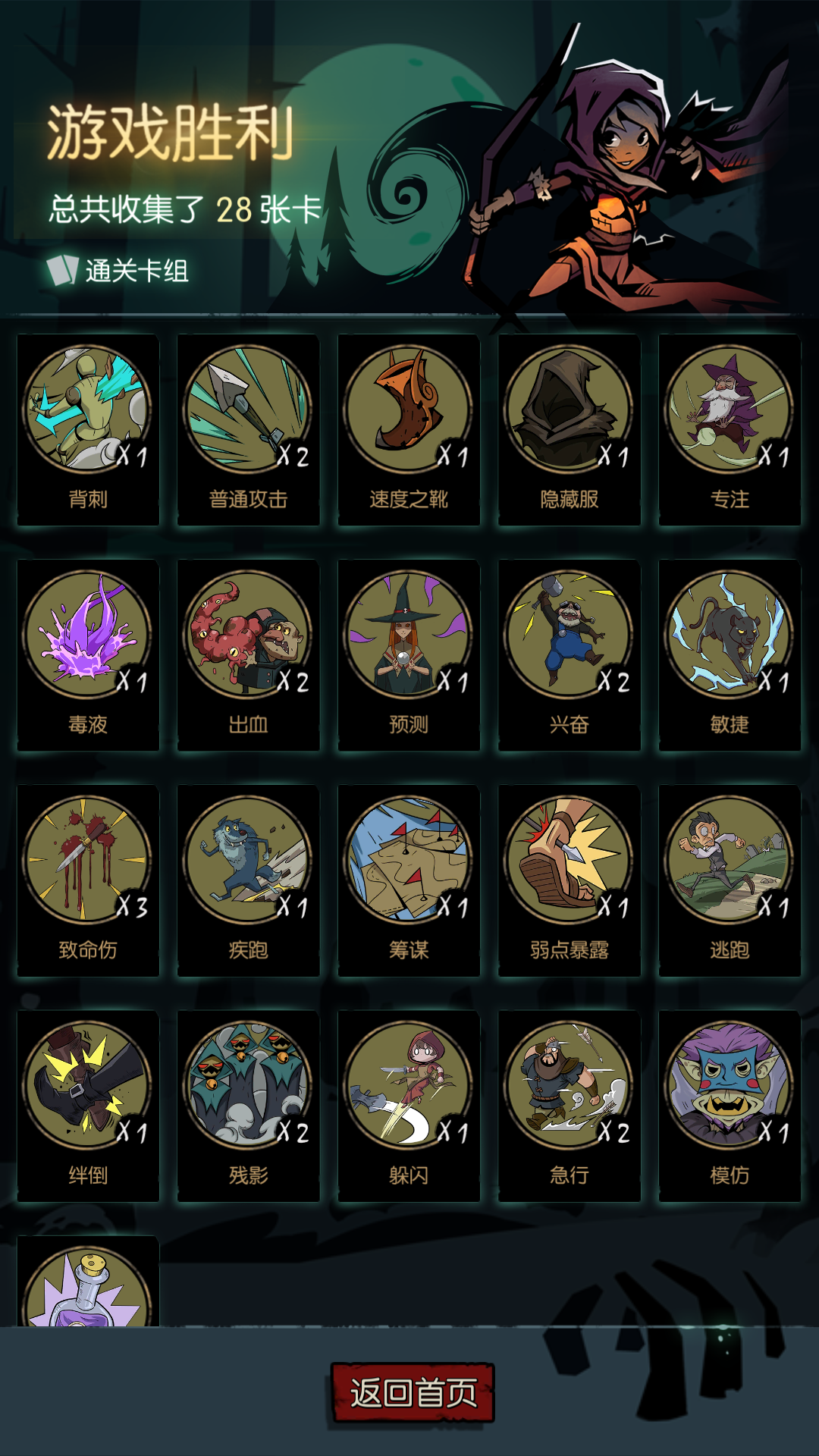 不错的游戏,用游侠通关了,哈哈,这套卡组连死神都吊打(然而还是被无头骑士吊打),虽然中毒效果没用,但闪避超高,而且一直摸牌,建议玩游侠时多入手些加行动力和摸牌的卡,后期初始卡‘’激励"不加行动力我把它扔了,攻击卡留两张射箭和背刺就行了。反正我的游侠核心就是行动力加摸牌,最后背刺,保命用闪避。以下是通过卡组。