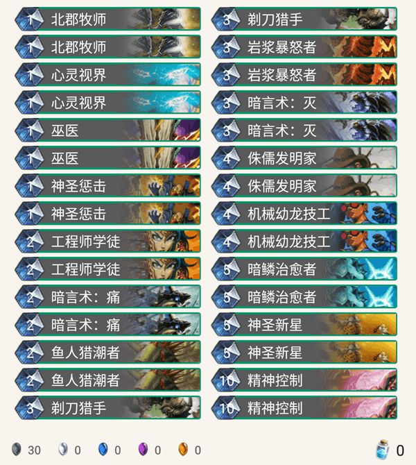 老三给我一种类似玩冰法的错觉,但区别是 key 牌摸到是可以随时打的,3费的巫医 技能,7费的娜迦 技能, nova 技能一共有六种方式让绿龙苏醒踢一脚,所以在能控下场面之后(甚至场面均势,要下怪提高攻击频率以及需要打出 nova 返场时)就能把这些 combo 打出了(注意算好解场方法,别让绿龙踢到墙上),北郡是起手必留的,如果能让北郡在场过一大波牌,就会好打许多,另外自己的怪基本上都会降到一血,攻击频率对场面很重要,所以我带了221,223和424这些一拖一卡牌以及岩浆暴怒者大神(无惧亡语者能力的勇者!)。痛最好给328和334,对面的大怪最多是454嘲讽和555铸剑师一类的,以及被套上真言术:触的的怪,能精控就精控,不行就灭,把握场上优势,过到上述combo的五个就赢了。