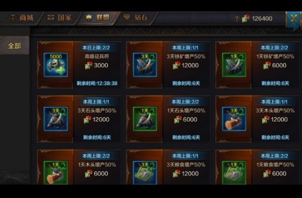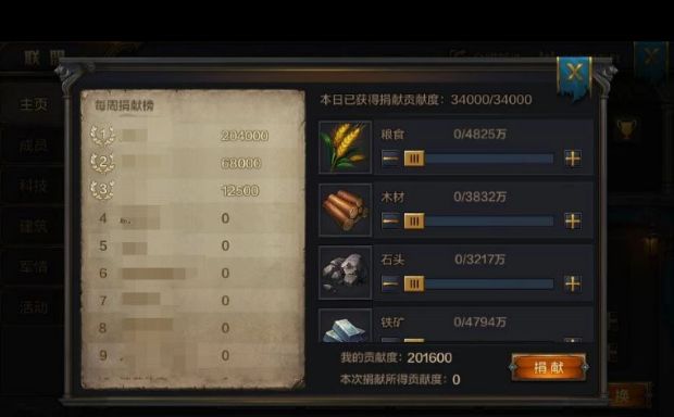 联盟中可以捐献资源获得贡献,每次贡献联盟会获取等价的联盟资金,联盟资金用于升级联盟的科技、建筑等;