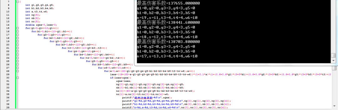g代表技能概率,b代表技能伤害倍数,t特指34武器的激光条数,w6是最后那个武器的武器伤害倍数。这里全部用的S级词条属性进行的运算,哪位大佬有SS的属性麻烦发我一下,但我估计结果变动不大。