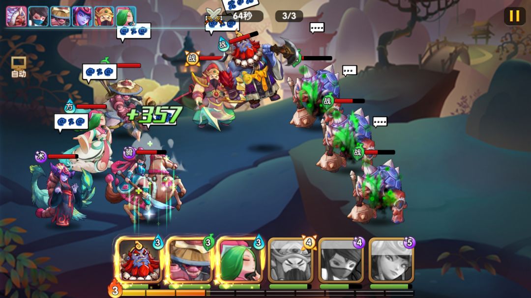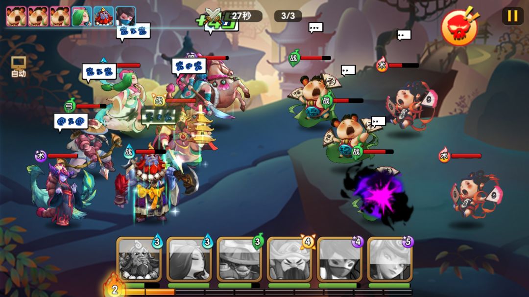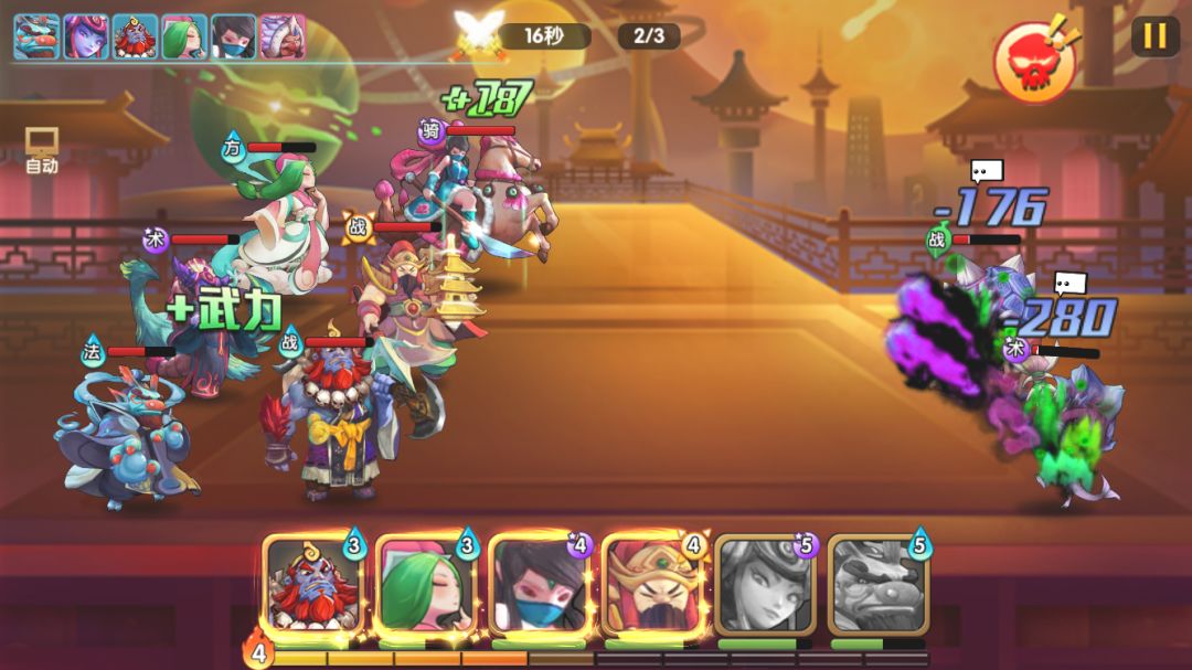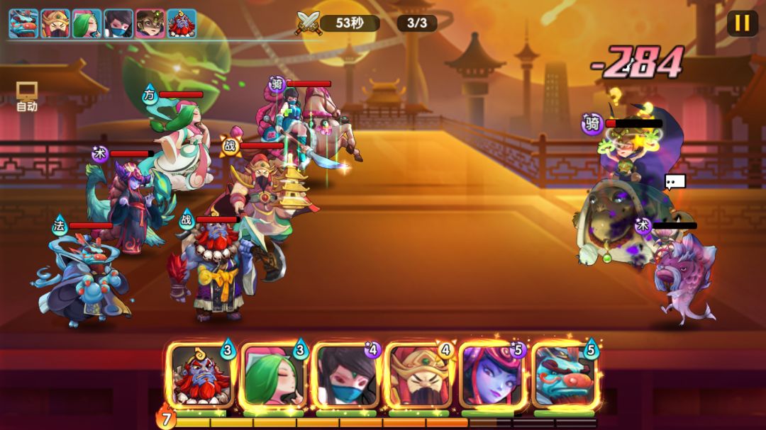 这关boss的爆发伤害不高,更多是小怪的二技能持续伤害比较高。因此楼主用石矶和龙王的被动封禁+晕眩来减缓压力,彩云救场,龟妈boss除了抗性高,输出一般,只要多封禁住小怪就比较容易三星过了。