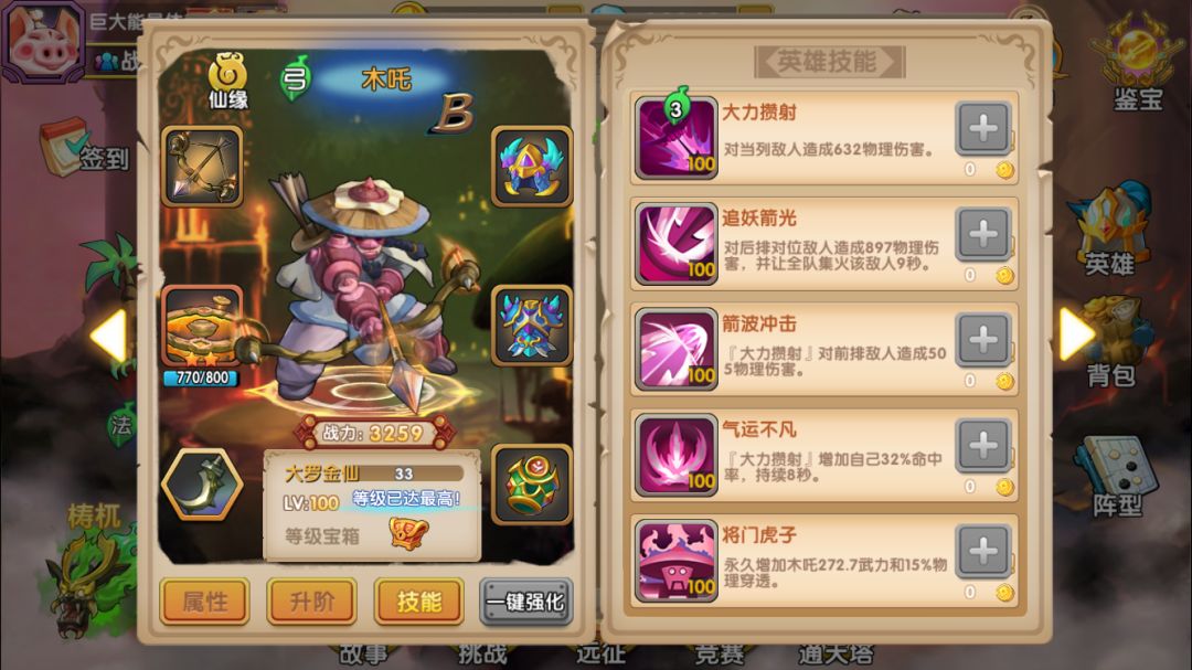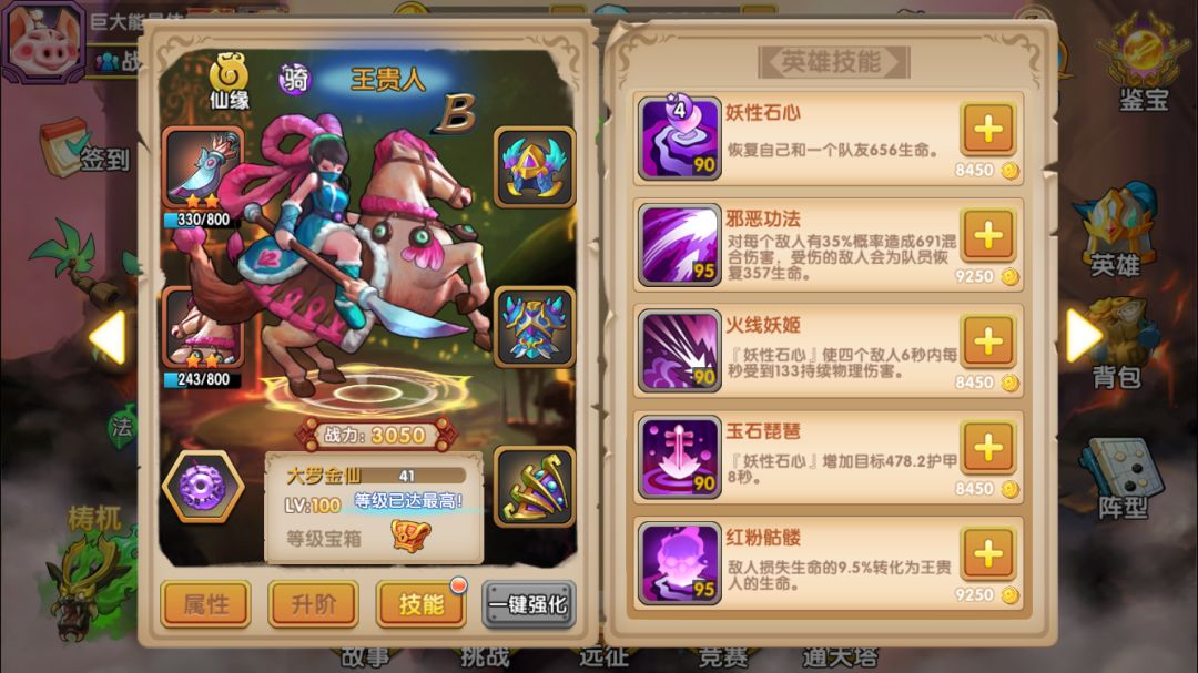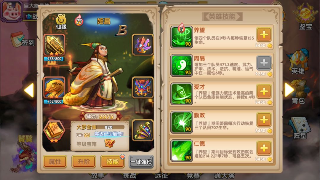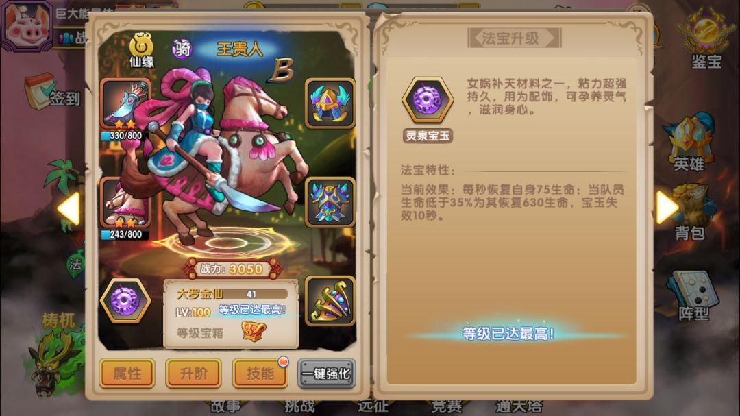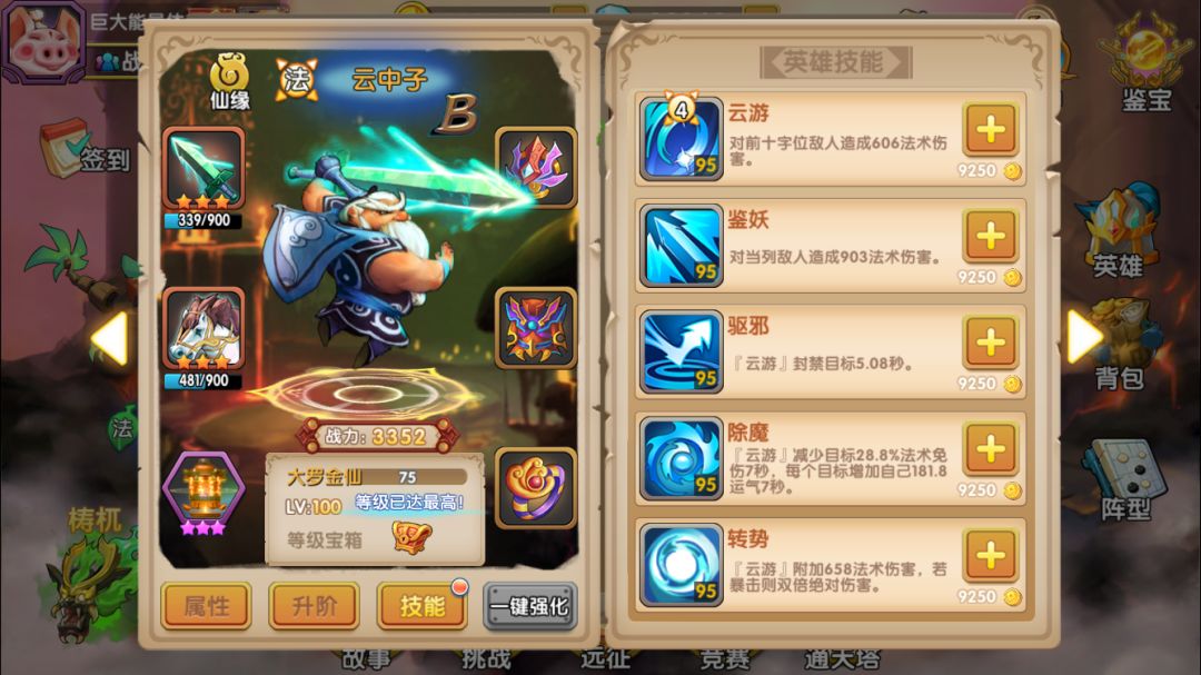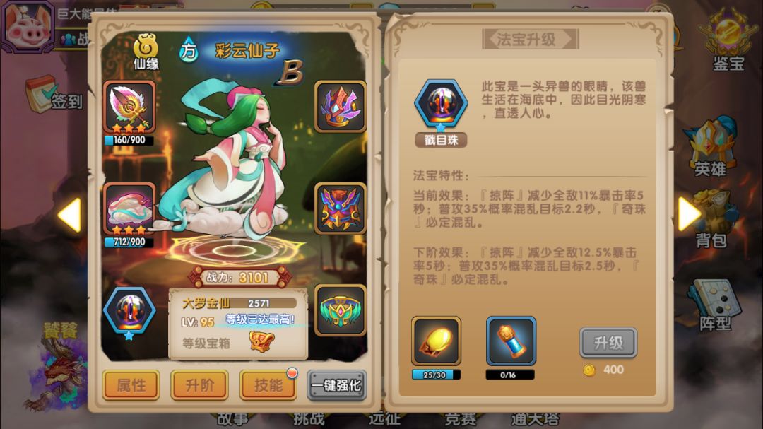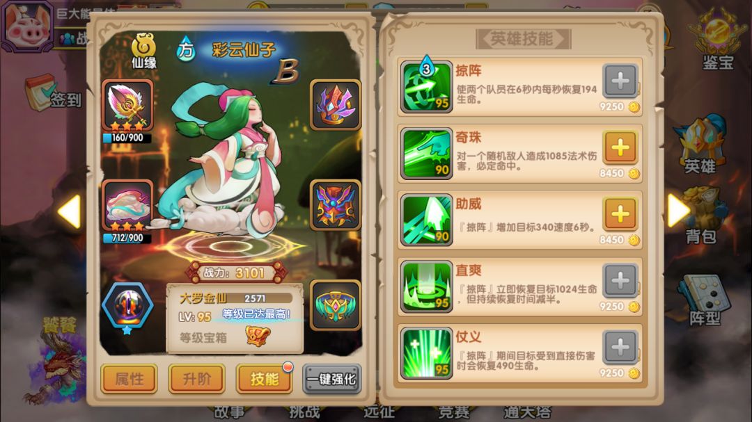 彩云仙子:已经一再强调过B本的生存环境恶劣,因此能3气救场的彩云是必上的英雄,要尽可能投入资源来培养。而彩云法宝的属性就比较一般,第一项减少暴击率的感觉不明显,该被暴击秒杀的还是被秒(手动滑稽);第二项是35%普攻混乱,升级不提升几率,目标单一,而且即使被混乱的敌人还是经常继续攻击我方(继续手动滑稽);第三项是二技能必定混乱,评价参见上一条。因此对彩云法宝的评价是一般,但作为必上的英雄,还是能满就满吧,万一有效果呢是不是(继续手动滑稽)。