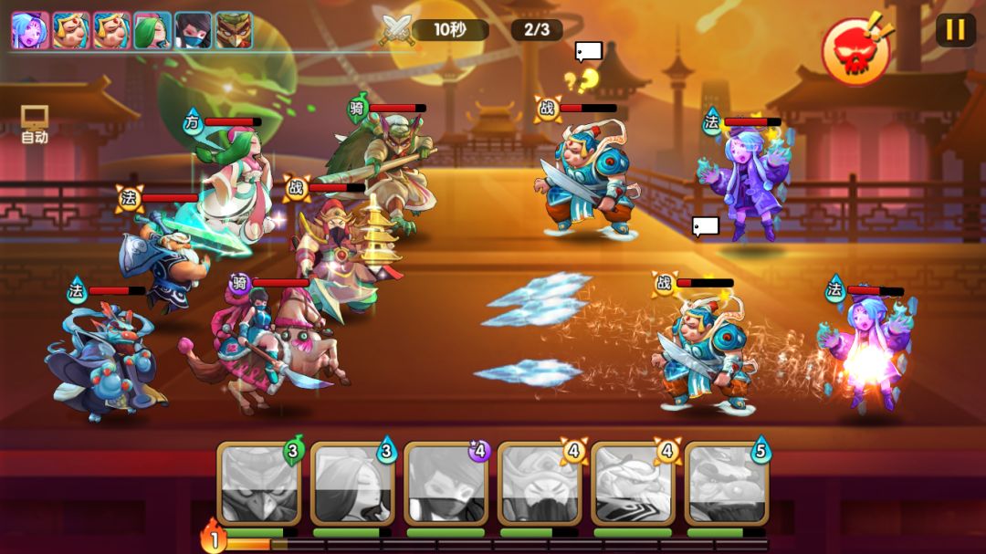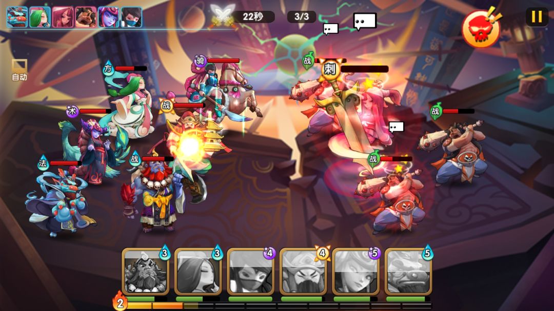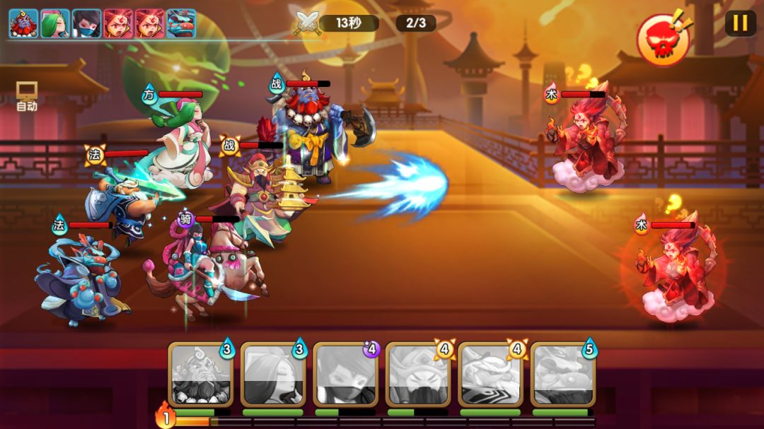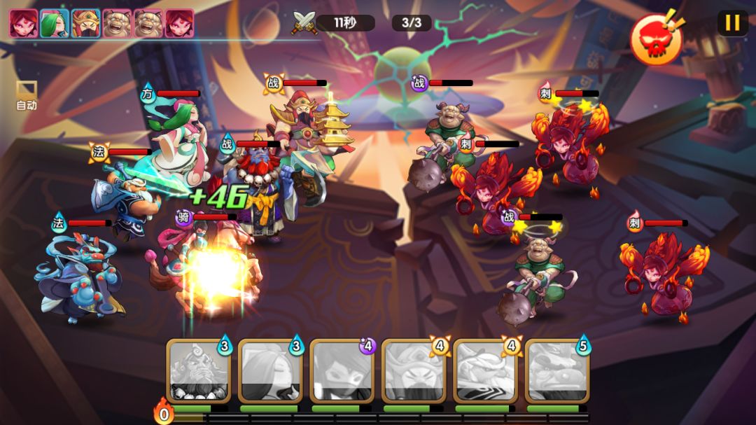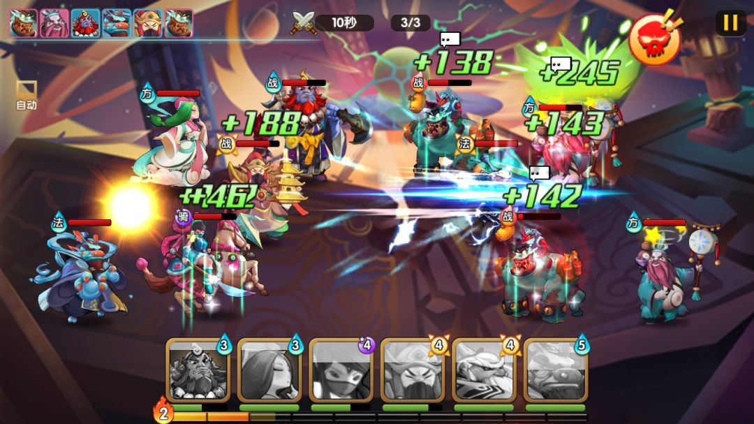 boss的群伤非常高,再配合小怪的群伤,开场我方的血线就被压成残废,加上是法术伤害,姬昌的群体加护甲在这关无用。由于生存压力太大,这关只能速战速决,用云中子二连大,开场赌暴击秒boss。但由于小怪伤害也很高,即使二连大秒了boss,残血前排还是有可能被小怪的补刀轮死。这关比较看脸,需要云中子二连暴击+多次触发龙王二技能减缓压力,需要多次尝试才能三星。