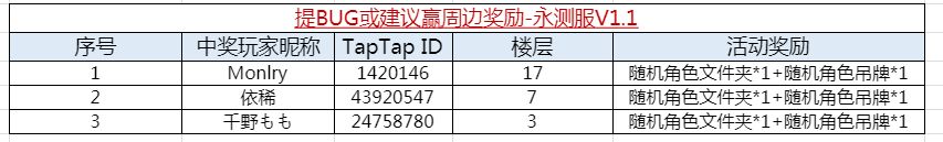 【获奖名单】永测服v1.1 BUG及建议反馈周边奖励名单