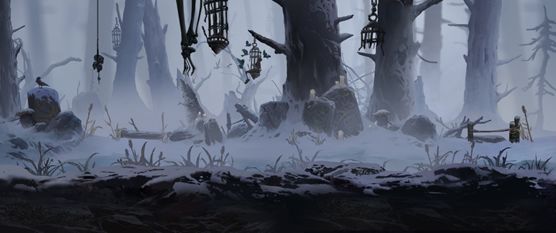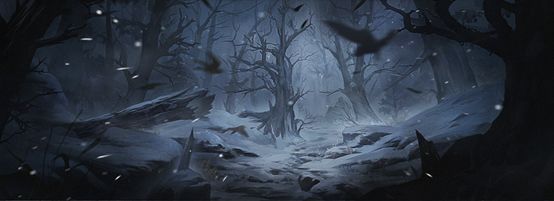 雪杉树林,白色树干。厚厚的积雪铺满大地,老国王的雕像无人护理。村庄看起来多已废弃,雪地里搭着简陋的帐篷。树木、石阵、雕像上都能见到大量的符文。
