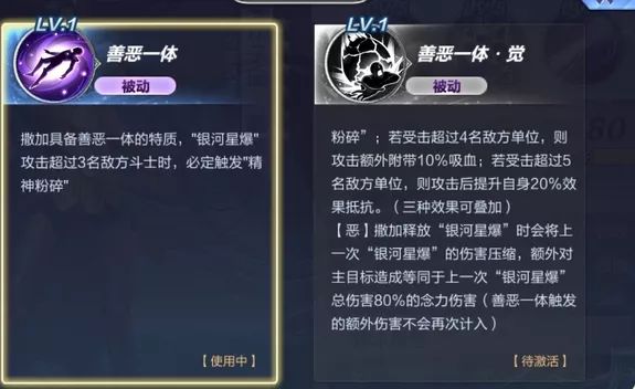 实力最接近神的男人:双子座撒加迎来了圣衣觉醒,撒加圣衣觉醒技能为被动善恶一体:撒加具备善恶一体的特质【善】撒加释放“银河星爆”时,若受击单位超过3名,则必定触发精神粉碎,若受击超过4名敌方单位,则攻击额外附带10%吸血;若受击超过5名敌方单位,则攻击后提升自身20%效果抵抗。(三种效果每回合可叠加)【恶】撒加释放“银河星爆”时会将上3次(满级)“银河星爆”造成的伤害压缩,额外对主目标造成等同于上3次(满级)[本次改动于11月18日体验服版本更新]“银河星爆”总伤害的120%(满级)的念力伤害(善恶一体触发额外伤害不会再次计入)数据来源体验服,不代表最终设计撒加的觉醒颠覆以往的群攻斗士单体输出能力较弱的设定,银河星爆搭配被动善恶一体将会越战越强,到最后甚至能无视藤蔓击杀主目标。觉醒后善恶一体中【恶】造成的伤害属于追加伤害,这样可以使撒加自带补刀能力,可以弱化纱织的复活或者龙牙免死效果。