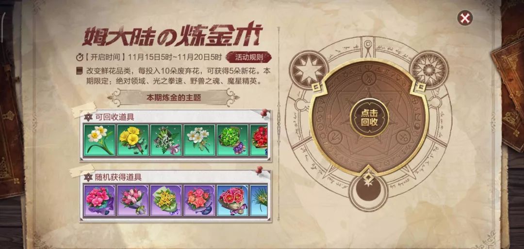 鲜花熔炼系统11月15日-11月20日限时上线,圣斗士们可以将多余的鲜花熔炼,换取新的鲜花,本期主题:绝对领域,光之拳速,野兽之魂,魔星精英,都是热门的殿堂。