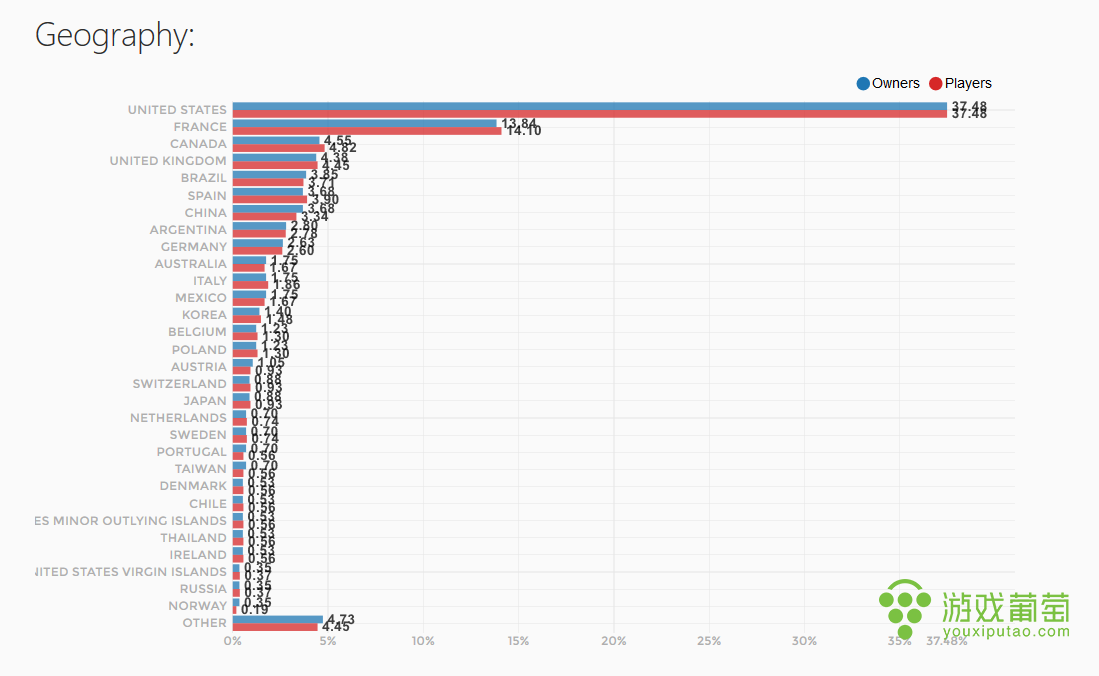 移动游戏方面,从App Annie统计的排名可以看到,上述两款手游有头部排名的市场,几乎都是在欧洲、北美的国家。其他平台游戏也是如此,年初发售的《龙珠斗士Z》的Steam版,仅美国玩家就占到了37%。