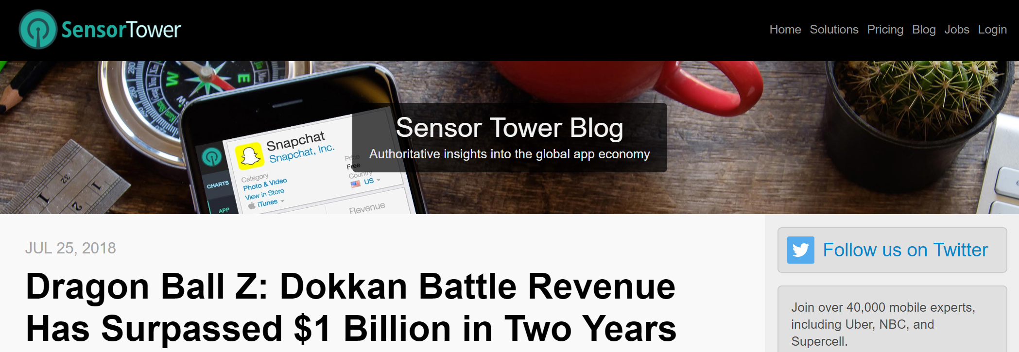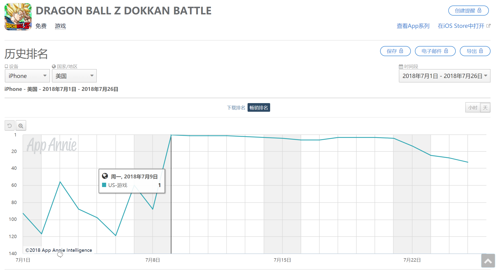 7月3日更新了版本后,上线已经两年多的《龙珠Z:爆裂激战》(Dragon Ball Z Dokkan Battle)排名迅速上升,甚至压过了强势霸榜的《堡垒之夜》一头,7月9日在美国畅销榜登顶,并在20多个国家进入畅销榜Top 10。