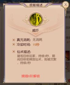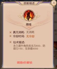 身为旷世灵妖嫦娥,拥有:赐福、戾气、威吓、赐福、御守技能,第一赐福技能提升300攻击力、75防御力、4500生命值,第二赐福技能提升600攻击力、150防御力、9000生命值,需要嫦娥8阶才能解锁。
