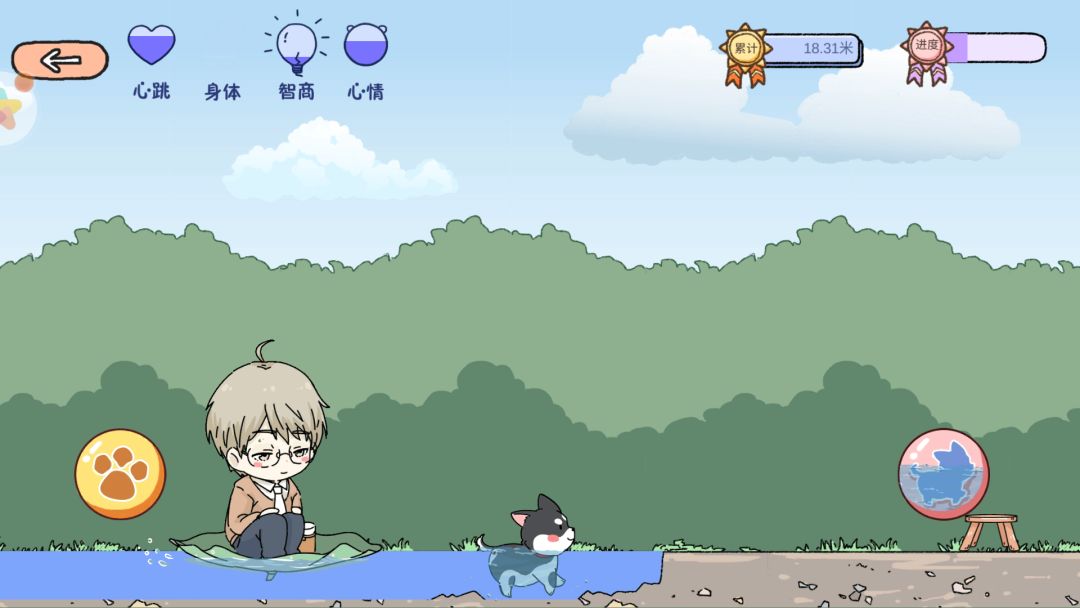 进入地图后,点击【左边】按钮——行走,点击【右边】按钮——跳跃/游泳,在遇到石头、坑、和水池的时候,让狗狗避开危险!