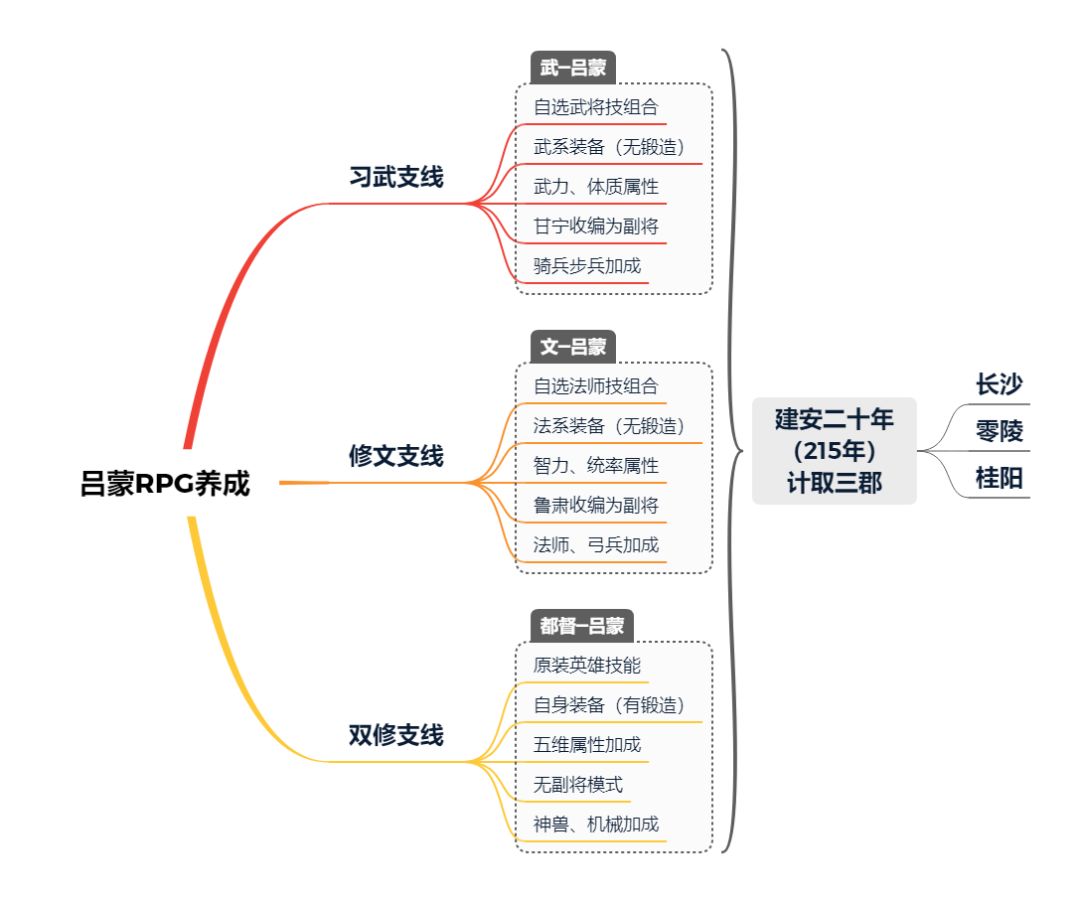 2、双修支线,玩家体会了两次单修支线后,吕蒙进阶都督职业,恢复自身技能,临时装备消失,可使用玩家自己装备。无副将帮助,给予英雄属性上的弥补,需协兵作战攻克后面关卡。