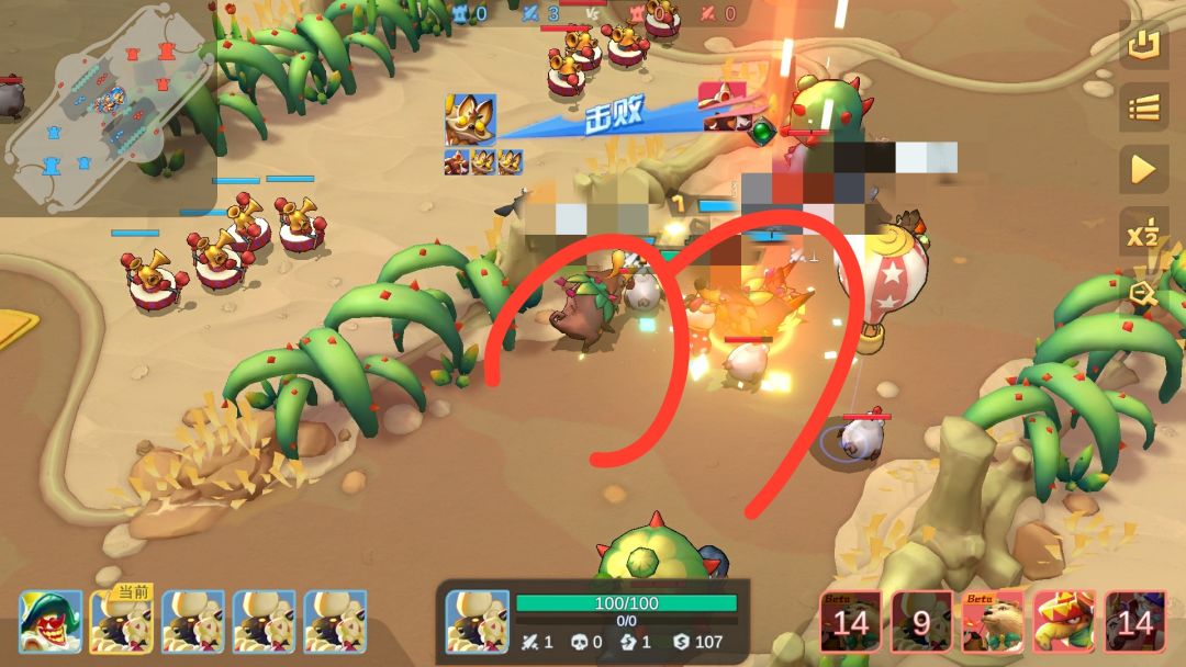 首先开局卖装备,然后随便打一打,就可以在第一波兵汇合前升到二形态,然后就≈通关了;