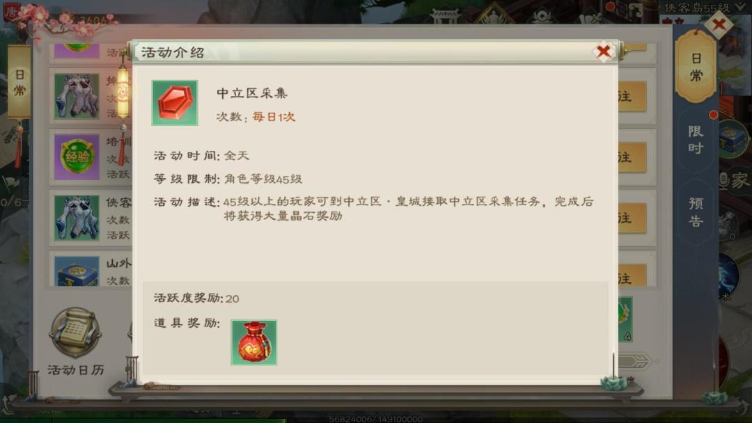 1.角色等级达到45级后,点击右上角“日常”选择“中立区采集”任务并点击前往,将自动寻路至中立皇城的采集区NPC
