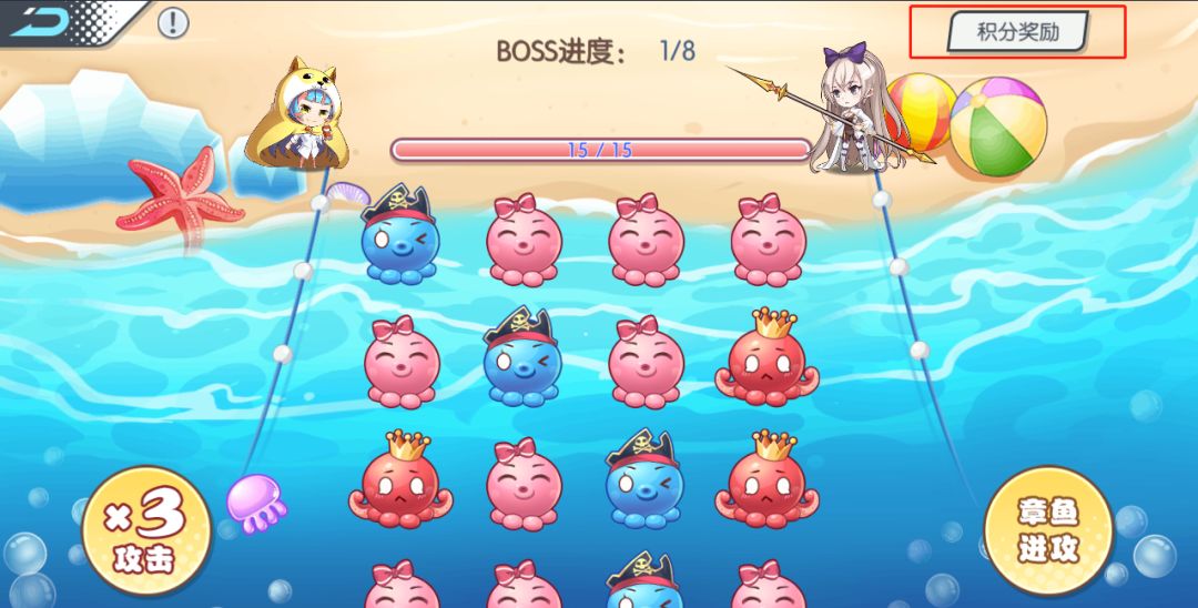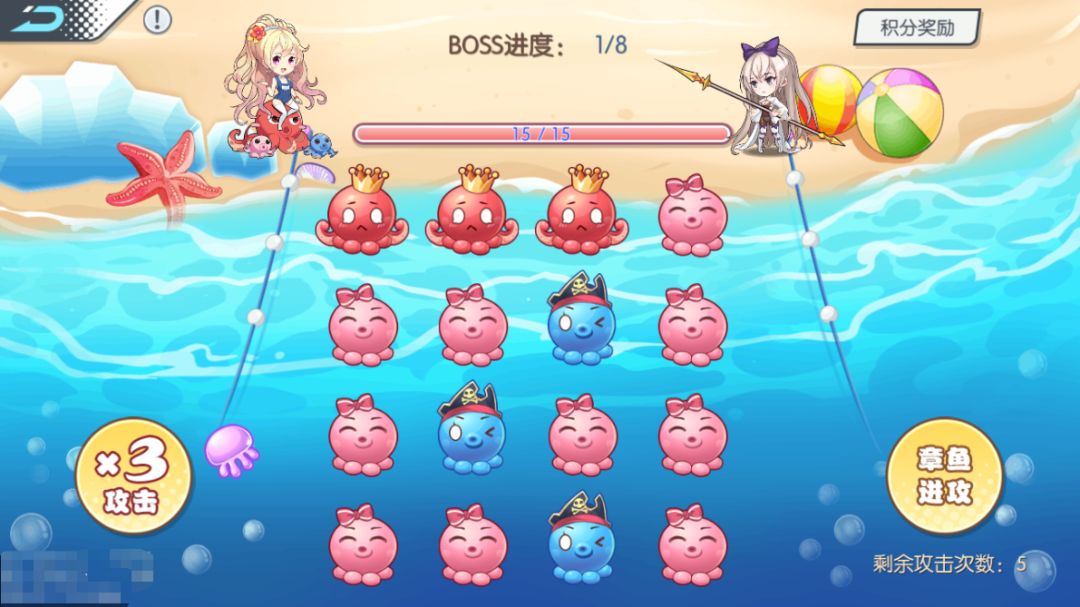 (3)活动内有三种章鱼攻击方式,粉红章鱼,冰蓝章鱼和火焰章鱼。每只粉红章鱼可对BOSS造成1点伤害,每只冰蓝章鱼可对BOSS造成3点伤害,每只火焰章鱼可对BOSS造成5点伤害。