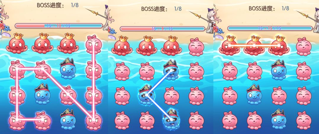 (4)通过连接相同类型的章鱼来攻击BOSS吧~学长每次只能连接同一种章鱼,连接可以是相邻的直线或斜线,连接的数量越多,造成的伤害也会越高哦,需要注意的是,伤害最高只能击杀当前的BOSS,溢出的伤害并不会转移到下一个BOSS上哦~