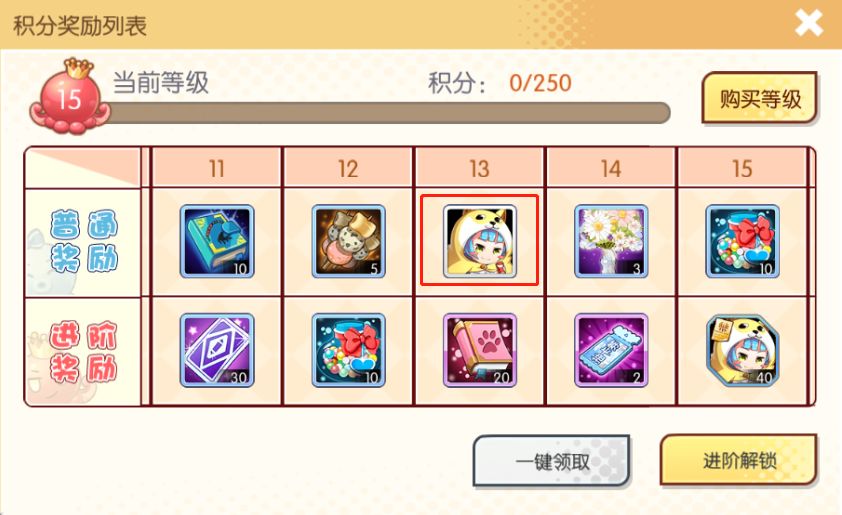 (2)【普通奖励】中,积分等级达到13级时可以获得蜜糖整卡。