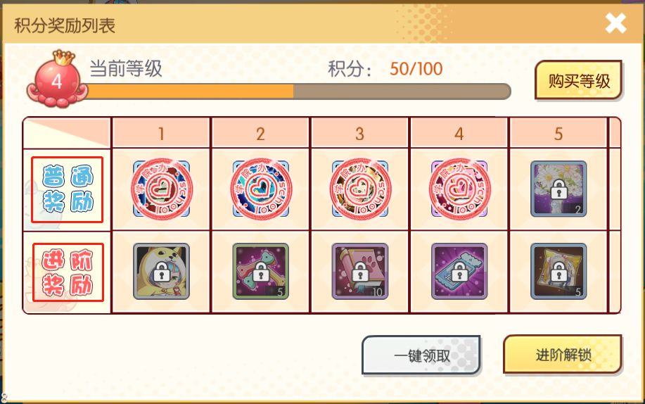 并且,【积分奖励】分为“普通奖励”和“进阶奖励”,其中“进阶奖励”需要购买礼包商店中出售的【进阶奖励解锁礼包】才可以获得。当然,购买了进阶礼包的学长仍然可以获得“普通奖励”哦~