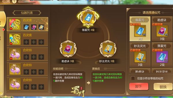 而即将推出的全新仙器系统将为诸位侠士的战力升级再助一臂之力,同时也会拉大诸位之间的实力差距,诸位侠士可通过佩戴仙器以及镶嵌通仙咒对自身的战力进行加成,目前即将现世的仙器有三种:合欢铃、七杀剑、百灵索,若要发挥出其最大的潜力还需镶嵌通仙咒,相应的通仙咒将会激活一定的新效果,在攻击时带来意想不到的强大助力!
