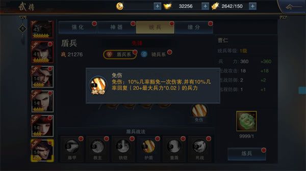 兵种在大方向上可以分为骑兵、步兵和弓兵三种类型,每个兵种还可以分为两个系列,每个系列下有6个小分支,小分支虽有差别,但是核心定位是一致的,先来看下步兵兵种的系列,步兵可以分为:盾兵系和枪兵系。其中盾兵的核心技能为免伤——10%几率豁免一次伤害,并有10%记录回复(20+最大兵力*0.02)的兵力。这个技能作为前排坦克系的步兵很重要,在对战中前排拼的就是兵力值,而免伤则很大程度上保证玩家兵力值。