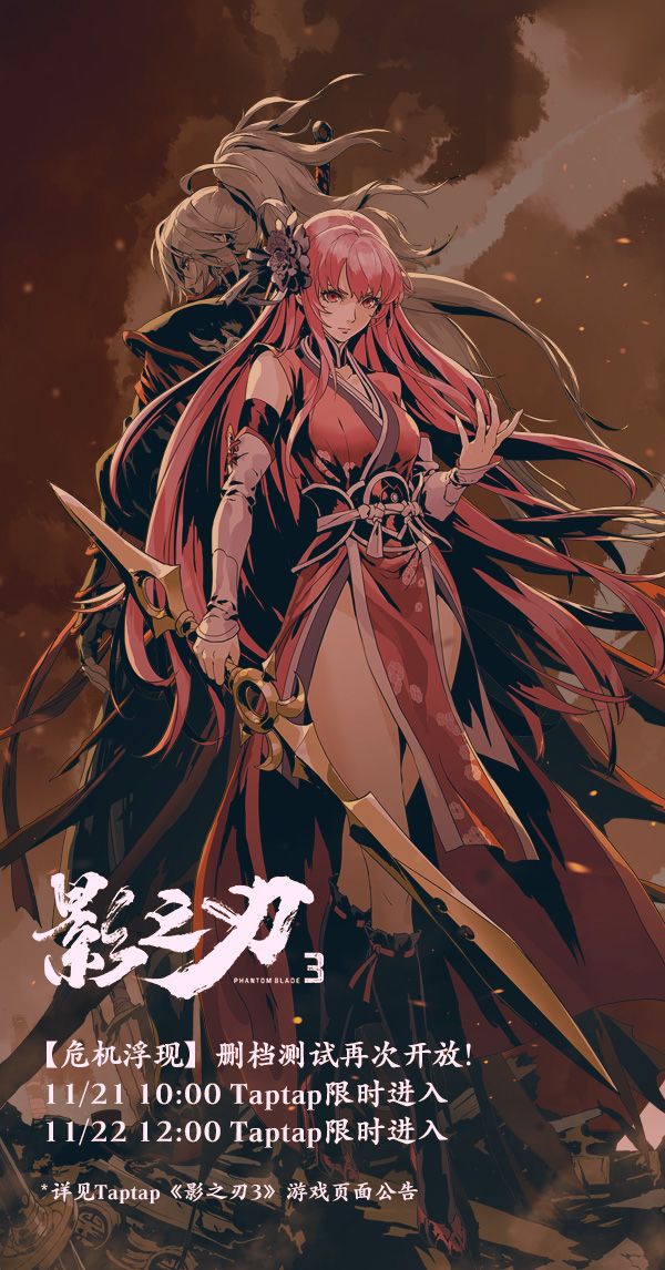 11月21日(周四)10:00及11月22日(周五)12:00,我们将在TapTap上限时开放10000个测试名额(每天各5000),此前预约《影之刃3》的玩家只要届时在《影之刃3(测试服)》界面点击“试玩”,即有机会获得测试资格,仅限安卓平台。