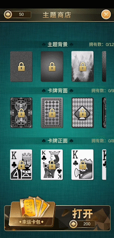 玩家可以用个主题的功能更换游戏的背景、扑克牌的牌面图案、扑克牌背景图案,还是比较有意思的哦~防止玩家的审美疲劳。