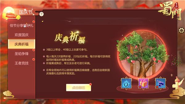 国庆佳节,不仅要独自庆祝,更要拉帮结派,带上自己的帮派一起来祈福庆祝。每个三级帮会中等级大于40级的帮会成员每天可进行【祝福】,每次祝福可获得固定奖励,50仙魂,30紫玄果及50万经验,同时增加祈福果的成熟度,当帮会累计祝福满200次,祈福果便会成熟,只有帮主及长老可进行采摘,同时可获得200万经验、200万灵力及500仙魂,每个帮派最多可进行10次采摘。