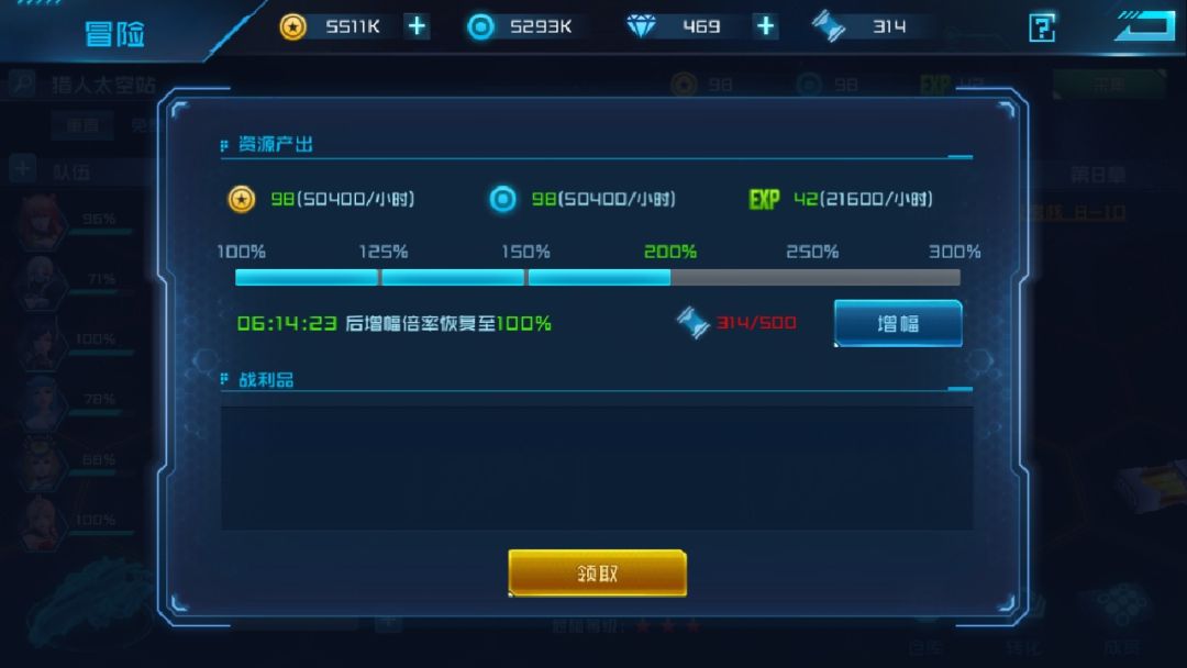 这里可以很明朗的看到每小时资源产出数量,用增幅济可以加速产出,打地图任意资源会爆不同数量的增幅济,每天地图刷的好,可以开启200%加速,一般开150加速也很容易,除非你很懒。