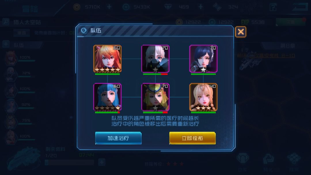 战斗结束后,只要队伍里有任何一个女神生命显示0%时,飞船是不能在太空站行走的,这个时候点击生命为0%的女神头像,可以暂时请离队伍,飞船才能继续前进。注意:请离队伍的女神是不会自动回复血量的噢,所以在闲时要把女神重新召回队伍!
