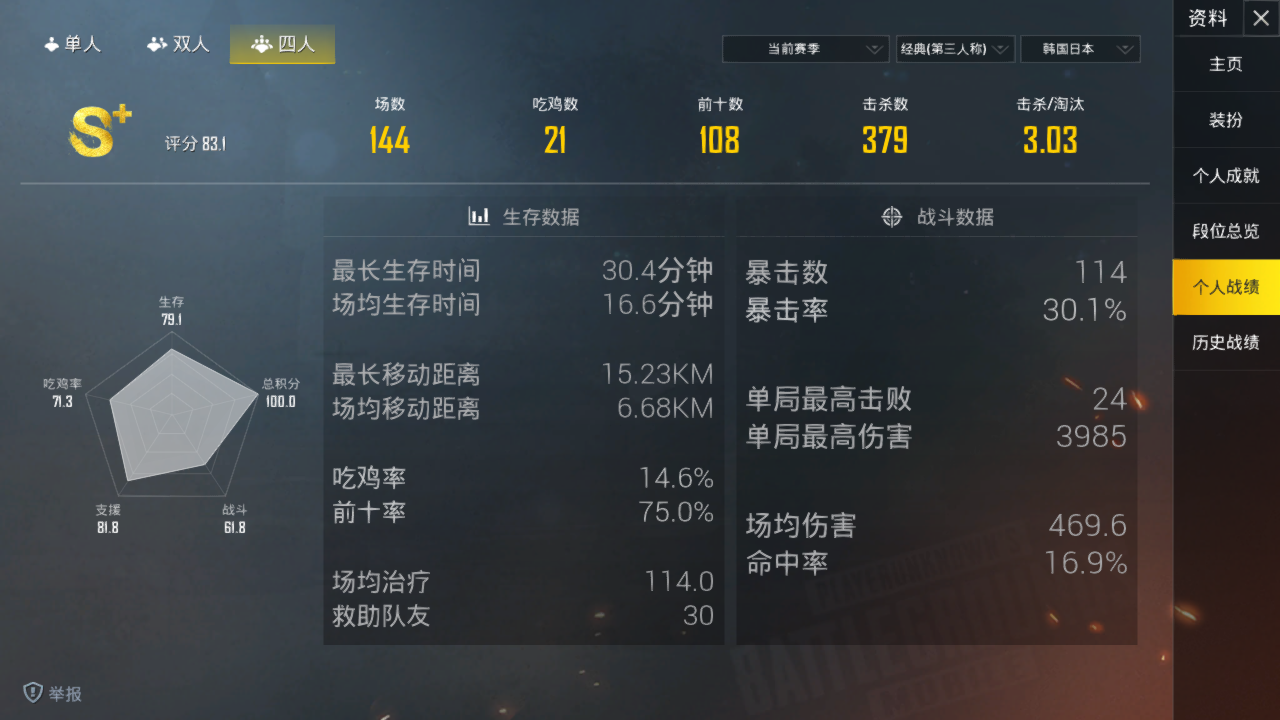 我先不说,是不是误封,因为我说误封,肯定要被喷,我就当我是个挂,请问我开挂为了什么,为了杀人?还是为了吃鸡?又或者就是为了挑战光子的机制?如果是为了杀人,吃鸡。我这战绩就已经说明一切了,被亚服打到自闭去了日韩服,两个服的战绩都在这儿,懂得人相信能看得出来,我是个中规中矩的玩家,没有什么过硬的技术,就普普通通。