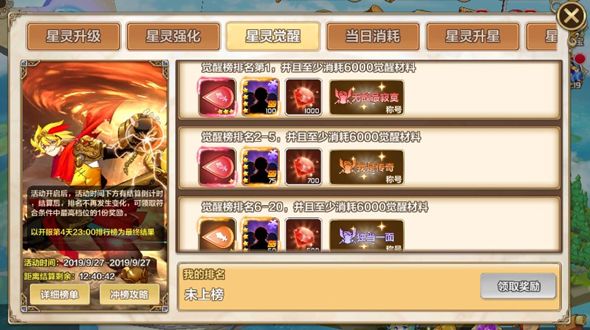 开服冲榜活动只在刚开的服前7天出现,一共分为6个榜:星灵升级榜、星灵强化榜、星灵觉醒榜、当日消耗榜(钻石消耗)、星灵升星榜、星灵攻击榜。活动前两天为升级榜,之后每天更换一个榜。每个榜结算时间为当日23点,结算后可以领取奖励。活动界面的左下角有详细的【冲榜攻略】,点击即可查看到对应榜单的冲榜攻略~