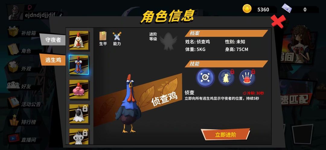 정찰 : 바로 모든 닭들과 문지기 위치 표시,5초동안 유지(쿨타임 : 30초)