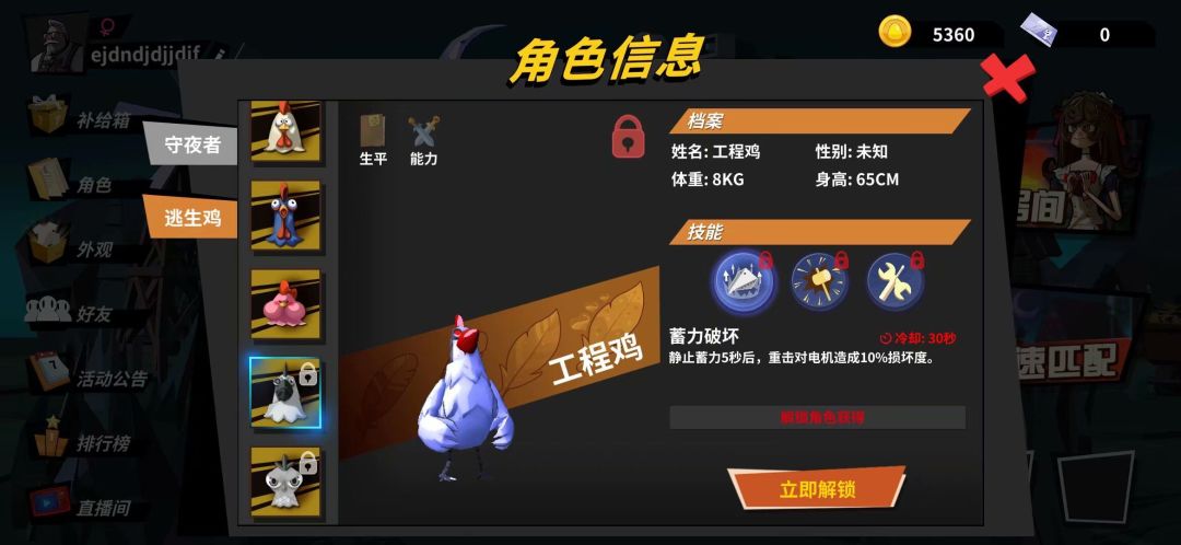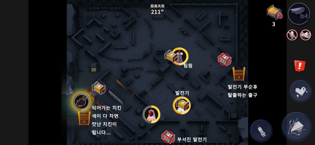 한 맵에 발전기는 총 7개가 있습니다, 그중 5개를 부셔야 맵에서 탈출할수있으며 닭은 두번째 공격을 받으면 문지기에게 잡혀 치킨이 되고맙니다...! 지도에서 표시되는 치킨은 이미 잡혀 노릇하게 구워지고 있는 팀원으로 치킨 색이 다 차면 죽으니 그 전에 구하는 것이 좋습니다.