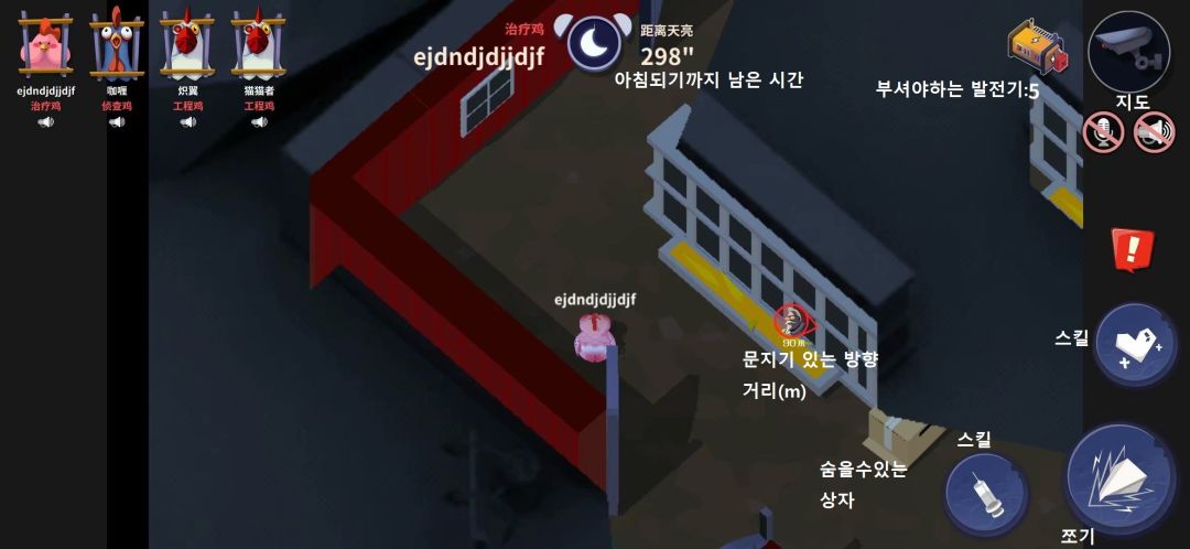 팀원들과 문지기씨가 확인을 눌렀다면 게임은 시작됩니다. 일단 닭을 선택하셨을 경우 농장의 어디인가에 떨궈져 헤매게되는데요. 화면은 아래와 같습니다, 맵은 일단 조그만 닭이 다니는 것치곤 꽤 넓은 편입니다. 중간에 문같은 장애물이 있긴하지만 바게트로 부시면 그냥 바로 날라가구요. 밤에는 어둑해서 문지기가 닭을 찾기 조금 힘드니 최대한 밤에 발전기를 다 부시는 것이 좋습니다. 발전기는 열심히 부리로 쪼면 파괴할수있으며 주위에 놓여진 상자안에 들어가 숨을수있습니다.