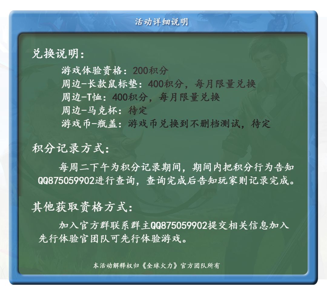 商店开启攒积分换福利,完成以下活动可获得积分哦,积分可兑换周边和先行体验官游戏体验资格,本活动现阶段未设置结束时间,临近结束会提前说明,福利中游戏体验资格时间为体验日起至15日后,游戏体验时间可以通过其他方式增长的哦。