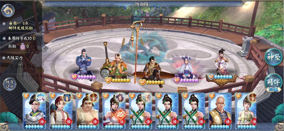 最后的最后,玩家可以在家园的左手边找到炁阵演武的功能。通过子言老师,每位玩家可以在这里布置自己在炁阵演武中的阵容与神坠。