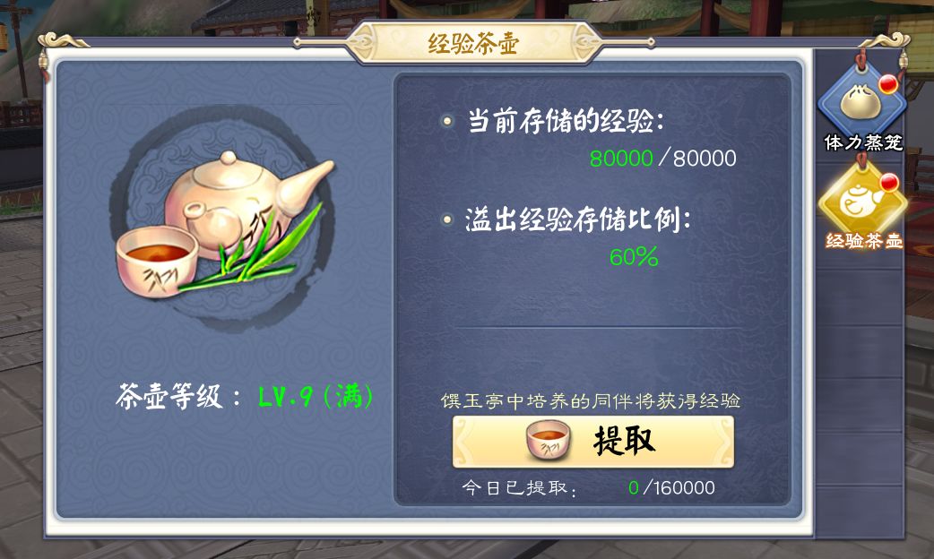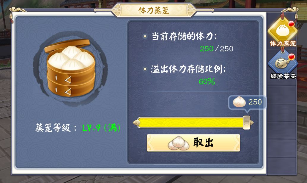 然后,我们来看看游刃大叔的蒸笼,蒸笼里一共分为两个功能:体力蒸笼与经验茶壶。