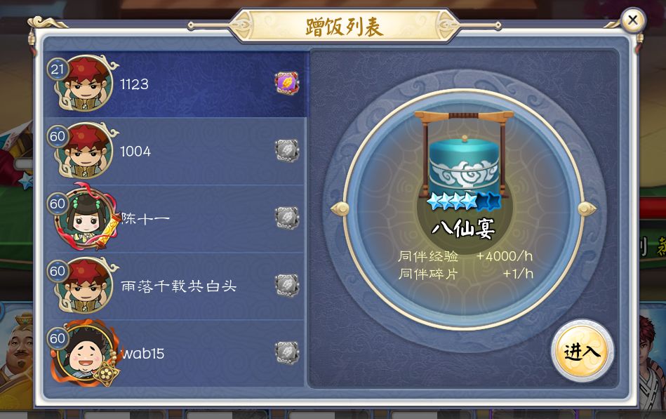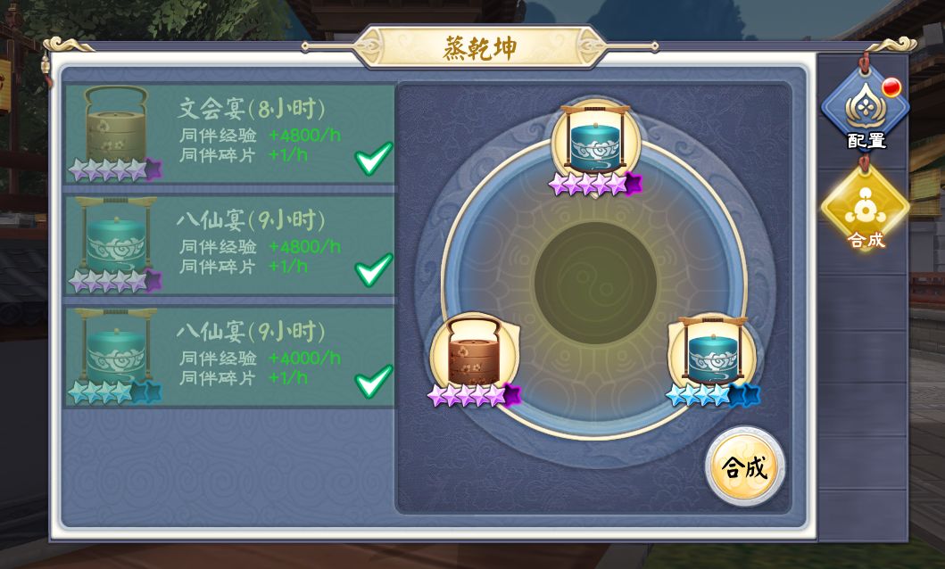 在桌子的最右边可以配置自己的佳宴类型,不同的佳宴可以产出不同的侠岚碎片,在吃完饭后,玩家有几率获得佳宴所对应的侠岚碎片。佳宴有等级之间的区分,使用等级越高的佳宴,在开饭后结算的奖励更丰厚。