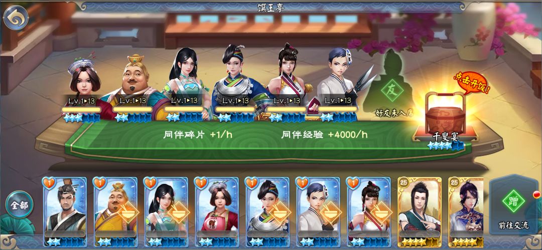 与辣妈谈话,就会进入馔玉亭中。馔玉亭中我们最多可以放置六名侠岚开饭,每一位被放置到餐桌上的侠岚都能在佳宴结束后获得一定量的经验。佳宴给予的经验不会因为吃饭人数而改变,所以最好凑齐六人后开饭能发挥佳宴最大的作用。