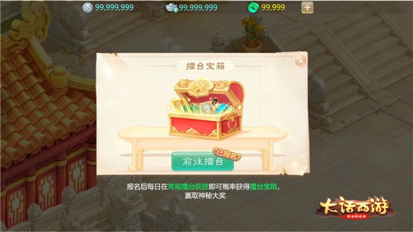 玩家上交200万银两即可报名参与“比武擂台”玩法,在PK获得胜利后将有机会能够获得“擂台宝箱”奖励,玩家首次守擂/攻擂成功1次,必得擂台宝箱1个,之后擂台PK中胜利还有概率获得擂台宝箱。每天总计最多可获得3个宝箱!