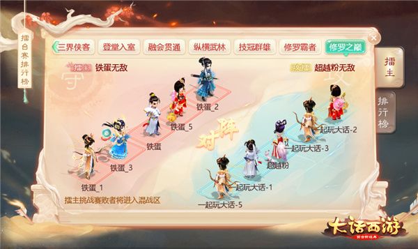作为此次新资料片中的重要玩法,周末限定的“擂台挑战赛”中,玩家们可以根据自己的等级和战力参加不同组别的擂台挑战,和全服高手一同争夺擂主之位与丰富奖品。